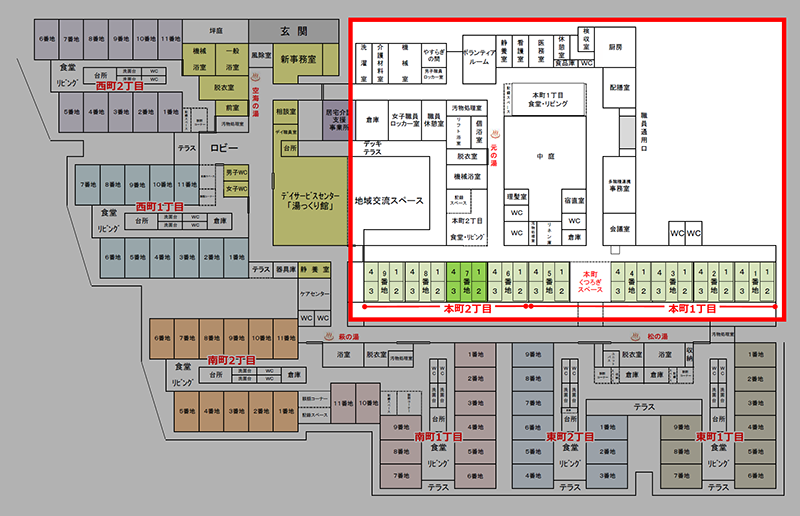正面玄関、受付、相談室、ロビー、デイサービスセンター、静養室、地域交流スペース、ケアセンター、本町(従来型)、西町、南町、東町(ユニット型)